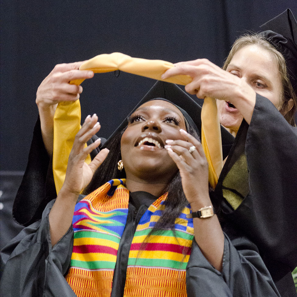 Photo: Assistant professor in teaching Klara Prachar hoods an M.S.W. graduate.